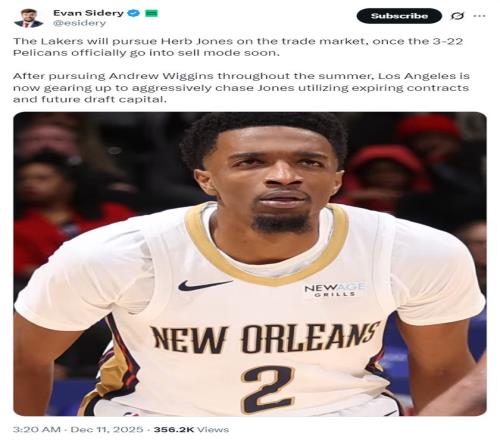 NBA记者埃文-斯迪瑞这样写道:一旦战绩3胜22负的鹈鹕队进入兜售模式,湖人队会在交易市场上猛烈追求赫伯特-琼斯。湖人整个休赛期都在关注安德鲁-威金斯,但如今他们已经将矛头转向了赫伯特-琼斯。