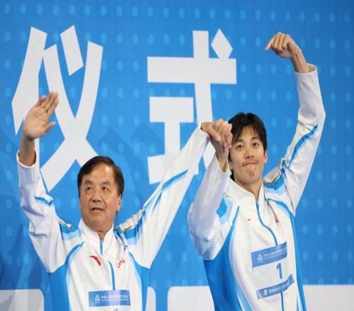 第三帧:颁奖仪式上,汪顺笑容灿烂,一手紧握教练,另一手指向教练朱志根。